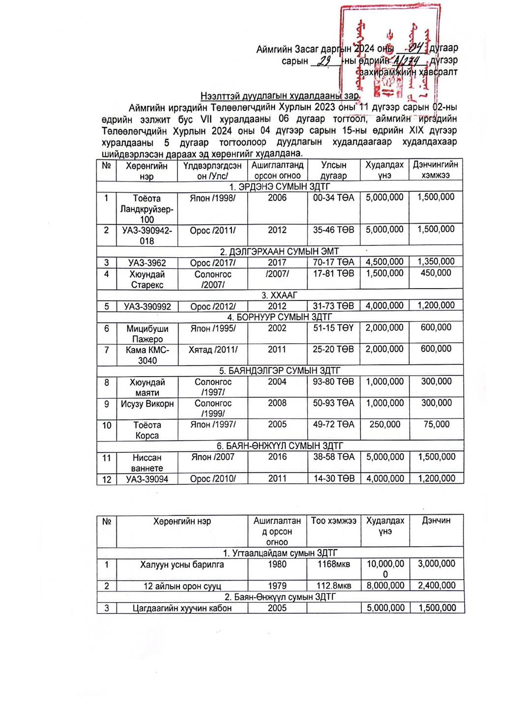 Дуудлагын худалдаанд оролцох хүсэлтийг 2024 оны 05 дугаар сарын 20-ны өдрийн 10 цаг 20 минут хүртэл Орон нутгийн өмчийн газрын 204 тоот өрөөнд хүлээн авна. Дуудлагын худалдаа нь 2024 оны 05 дугаар сарын 20-ны өдрийн 10:30-д Орон нутгийн өмчийн газар (Төр, захиргааны 2 дугаар байр)-ын хурлын зааланд явагдана. Дуудлагын худалдаанд оролцох хүсэлтийн маягт, дэнчин, оролцох эрхийн төлбөр болох 50,000 төгрөг төлсөн баримт, иргэний үнэмлэхийн хуулбар зэрэг баримтыг ирүүлнэ. Дээрх эд хөрөнгийг тухайн эд хариуцагч сум, байгууллага дээр очиж үзэж болох бөгөөд мэдээллийг 7027-2483 утсаар холбогдон авна уу.